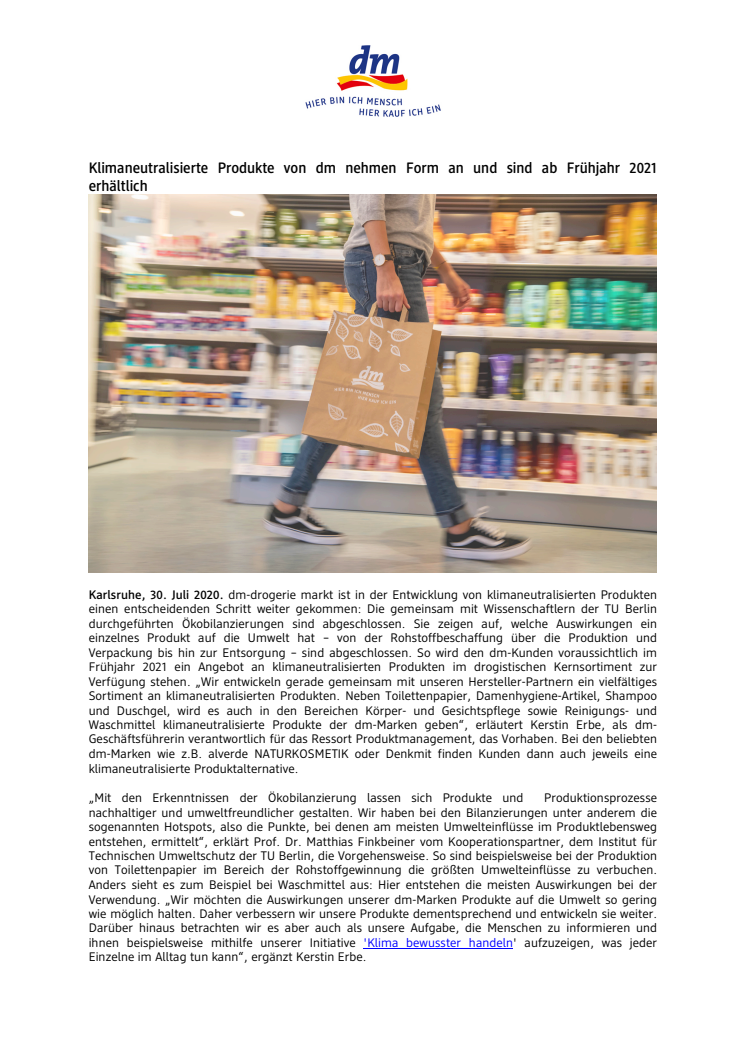 dm-drogerie markt ist in der Entwicklung von klimaneutralisierten Produkten einen entscheidenden Schritt weiter gekommen: Die gemeinsam mit Wissenschaftlern der TU Berlin durchgeführten Ökobilanzierungen sind abgeschlossen. So wird den dm-Kunden voraussichtlich im Frühjahr 2021 ein Angebot an klimaneutralisierten Produkten im drogistischen Kernsortiment zur Verfügung stehen.