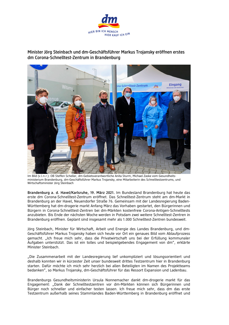 Minister Jörg Steinbach und dm-Geschäftsführer Markus Trojansky eröffnen erstes dm Corona-Schnelltest-Zentrum in Brandenburg