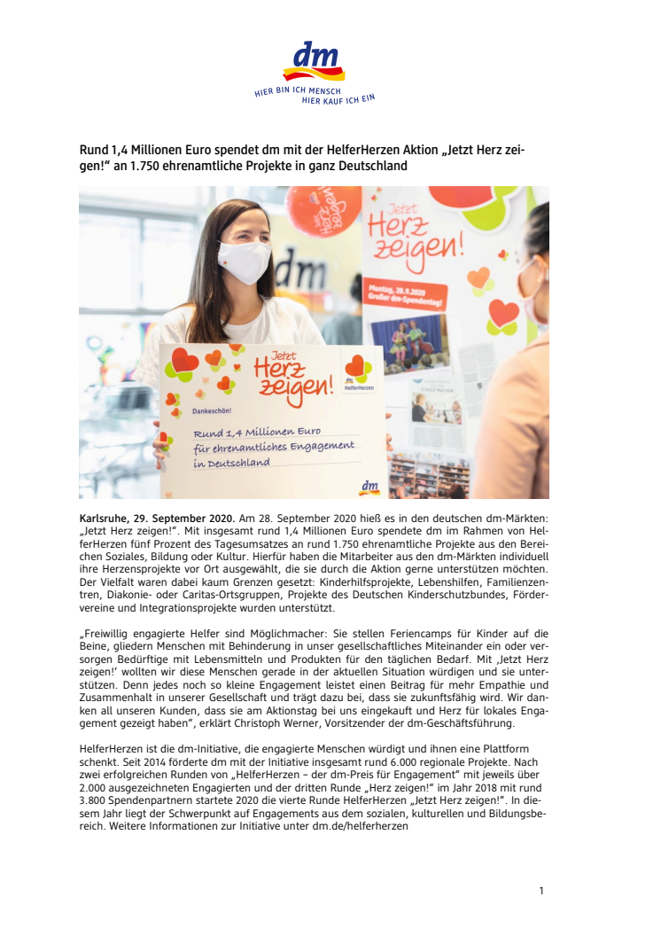Am 28. September 2020 hieß es in den deutschen dm-Märkten: „Jetzt Herz zeigen!“. Mit insgesamt rund 1,4 Millionen Euro spendete dm im Rahmen von HelferHerzen fünf Prozent des Tagesumsatzes an rund 1.750 ehrenamtliche Projekte aus den Bereichen Soziales, Bildung oder Kultur.