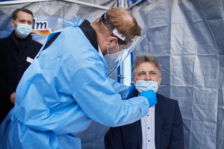 Oberbürgermeister Frank Mentrup lässt sich im dm Corona-Schnelltest-Zentrum von geschulten dm-Mitarbeitern testen (im Hintergrund Christoph Werner, Vorsitzender der dm-Geschäftsführung).