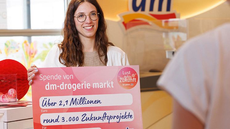 dm-Mitarbeiterin hält einen Spenndenscheck von über 2,1 Millionen Euro in den Händen.