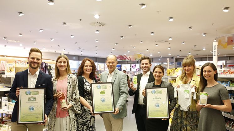 Das Zertifikat mit Gütesiegel überreichte Norbert Lux (CEO der GREEN BRANDS Organisation GmbH mit Hauptsitz in Veitsbronn bei Nürnberg) an die Markenverantwortlichen Alexander Diefenbacher (alverde NATURKOSMETIK), Elena de Punzio (ALANA), Nina Zikmund (ALANA), Kerstin Rühl (ALANA), Marlene Jonas (dmBio), Christian Kluge (dmBio) sowie Stefanie Schönherr (Produktmanagement/Nachhaltigkeit).