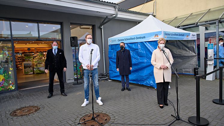 Ende März eröffnete dm im Saarland das erste Schnelltest-Zentrum in Anwesenheit von Ministerpräsident Tobias Hans, wenige Tage später folgte die Eröffnung in Mecklenburg-Vorpommern, zu der Ministerpräsidentin Manuela Schwesig nach Schwerin kam, um sich ein Bild vom Ablauf in einem dm Corona-Schnelltest-Zentrum zu machen.