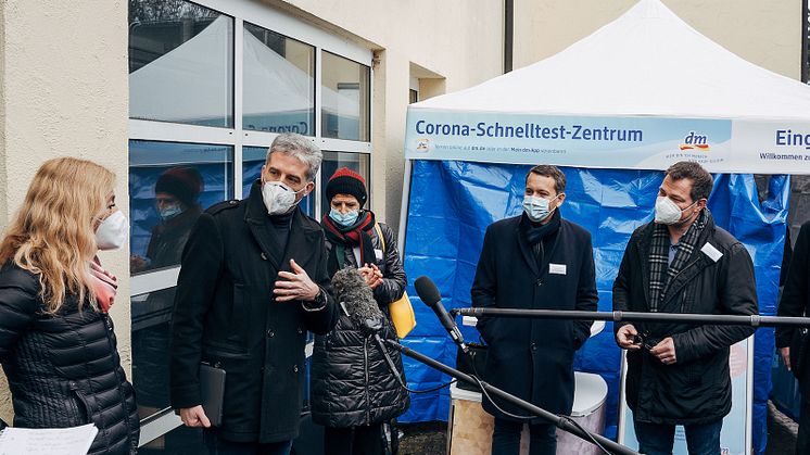 Christoph Werner und Boris Palmer wurden bei der heutigen Eröffnung begleitet von Dr. Lisa Federle, Sabine Hagmann, Hauptgeschäftsführerin des HDE Baden-Württemberg, und Christian Harms, als dm-Geschäftsführer verantwortlich für das Ressort Mitarbeiter und das Projekt Schnelltest-Zentren, um auch die Detailfragen der anwesenden Medienvertreter sachkundig beantworten zu können.