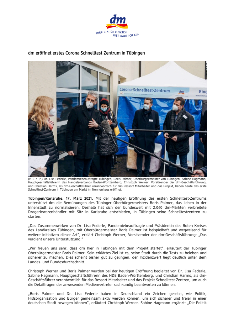 Mit der heutigen Eröffnung des ersten Schnelltest-Zentrums unterstützt dm die Bemühungen des Tübinger Oberbürgermeisters Boris Palmer, das Leben in der Innenstadt zu normalisieren. Deshalb hat sich der bundesweit mit 2.040 dm-Märkten verbreitete Drogeriewarenhändler mit Sitz in Karlsruhe entschieden, in Tübingen seine Schnelltestzentren zu starten.