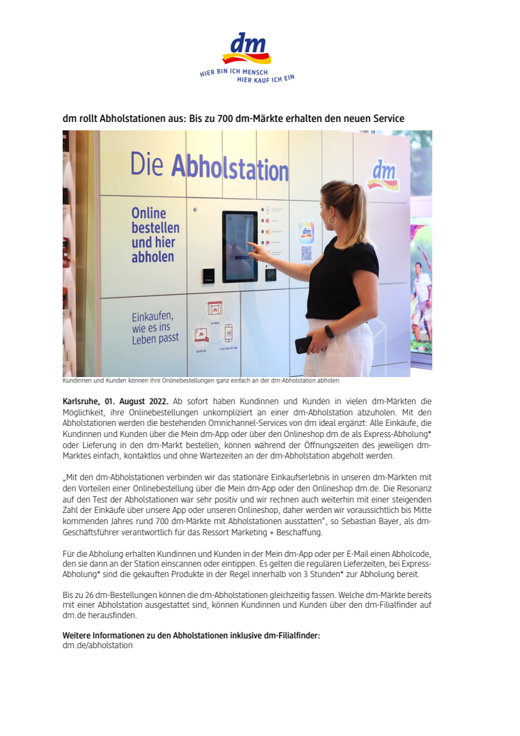 „Mit den dm-Abholstationen verbinden wir das stationäre Einkaufserlebnis in unseren dm-Märkten mit den Vorteilen einer Onlinebestellung über die Mein dm-App oder den Onlineshop dm.de. Die Resonanz auf den Test der Abholstationen war sehr positiv und wir rechnen auch weiterhin mit einer steigenden Zahl der Einkäufe über unsere App oder unseren Onlineshop, daher werden wir voraussichtlich bis Mitte kommenden Jahres rund 700 dm-Märkte mit Abholstationen ausstatten“, so Sebastian Bayer, als dm-Geschäftsführer verantwortlich für das Ressort Marketing + Beschaffung.