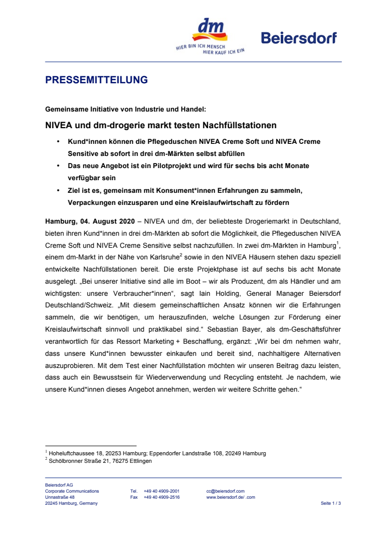 NIVEA und dm, der beliebteste Drogeriemarkt in Deutschland, bieten ihren Kund*innen in drei dm-Märkten ab sofort die Möglichkeit, die Pflegeduschen NIVEA Creme Soft und NIVEA Creme Sensitive selbst nachzufüllen. In zwei dm-Märkten in Hamburg (Hoheluftchaussee 18, 20253 Hamburg; Eppendorfer Landstraße 108, 20249 Hamburg), einem dm-Markt in der Nähe von Karlsruhe (Schöllbronner Straße 21, 76275 Ettlingen) sowie in den NIVEA Häusern stehen dazu speziell entwickelte Nachfüllstationen bereit. Die erste Projektphase ist auf sechs bis acht Monate ausgelegt. „Bei unserer Initiative sind alle im Boot – wir als Produzent, dm als Händler und am wichtigsten: unsere Verbraucher*innen“, sagt Iain Holding, General Manager Beiersdorf Deutschland/Schweiz. „Mit diesem gemeinschaftlichen Ansatz können wir die Erfahrungen sammeln, die wir benötigen, um herauszufinden, welche Lösungen zur Förderung einer Kreislaufwirtschaft sinnvoll und praktikabel sind.“ Sebastian Bayer, als dm-Geschäftsführer verantwortlich für das Ressort Marketing + Beschaffung, ergänzt: „Wir bei dm nehmen wahr, dass unsere Kund*innen bewusster einkaufen und bereit sind, nachhaltigere Alternativen auszuprobieren. Mit dem Test einer Nachfüllstation möchten wir unseren Beitrag dazu leisten, dass auch ein Bewusstsein für Wiederverwendung und Recycling entsteht. Je nachdem, wie unsere Kund*innen dieses Angebot annehmen, werden wir weitere Schritte gehen.“